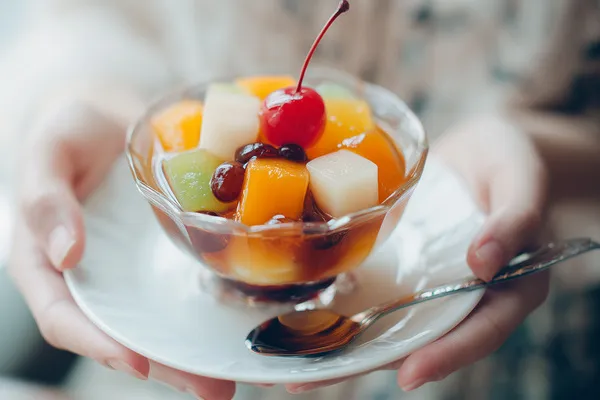 北海道産小豆を使った自家製餡に、寒天・白玉・季節の果実を合わせた涼味豊かな一品。